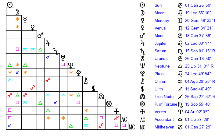 | Uranus | 26 Cancer 20 | 29 Taurus 22 | 0 Leo 27 |