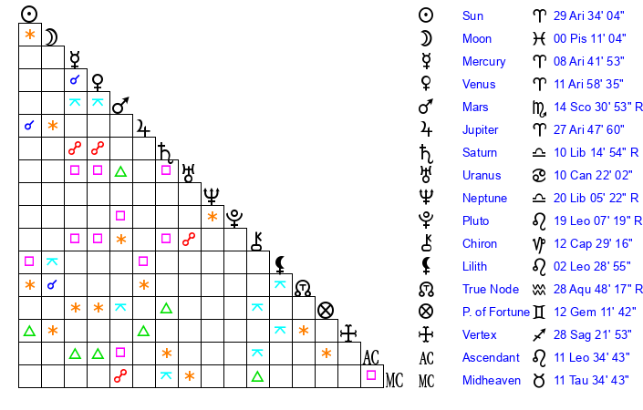 | Pluto | 19 Leo 7 | 3 Aquarius 45 | 19 Leo 55 |
