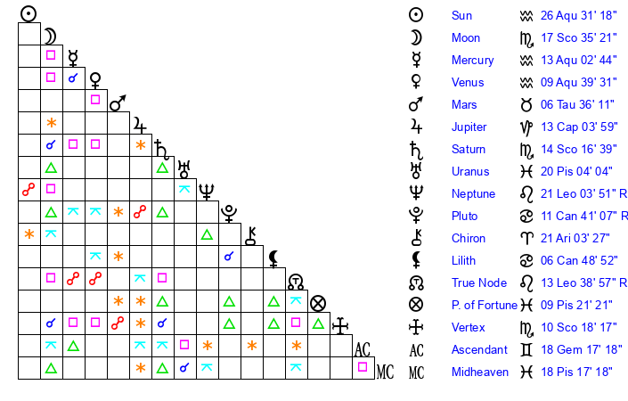 | Saturn | 14 Scorpio 49 | 19 Pisces 1 | 9 Scorpio 50 |