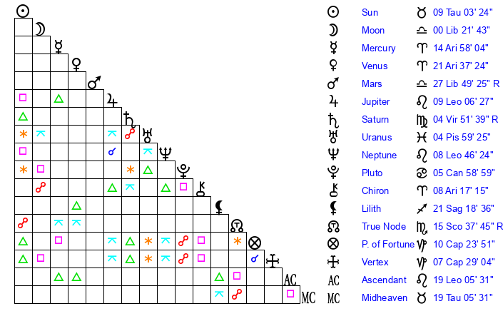 | Sun | 9 Taurus 3 | 9 Taurus 38 | 19 Leo 38 |