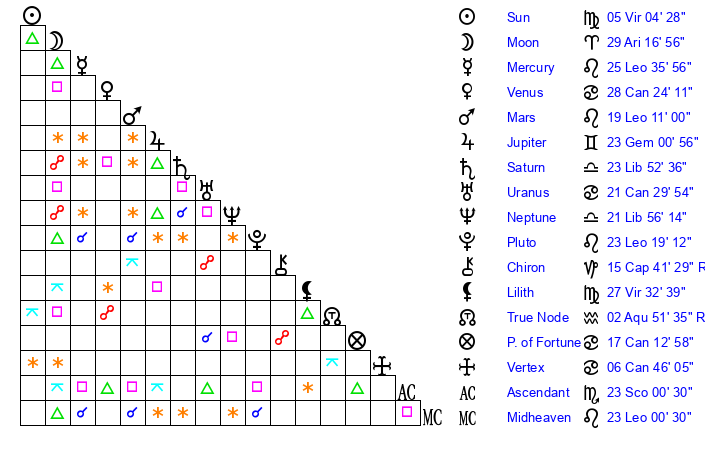 | Mercury | 25 Leo 36 | 21 Leo 4 | 28 Scorpio 54 |