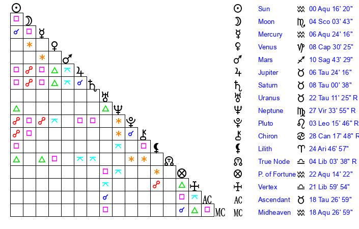| Mercury | 6 Aquarius 25 | 18 Capricorn 16 | 3 Aries 52 |