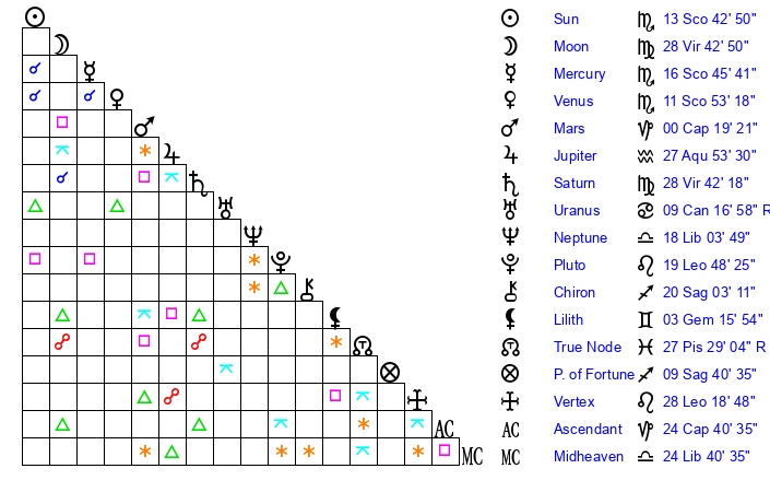 | Sun | 13 Scorpio 43 | 14 Scorpio 32 | 29 Capricorn 50 |