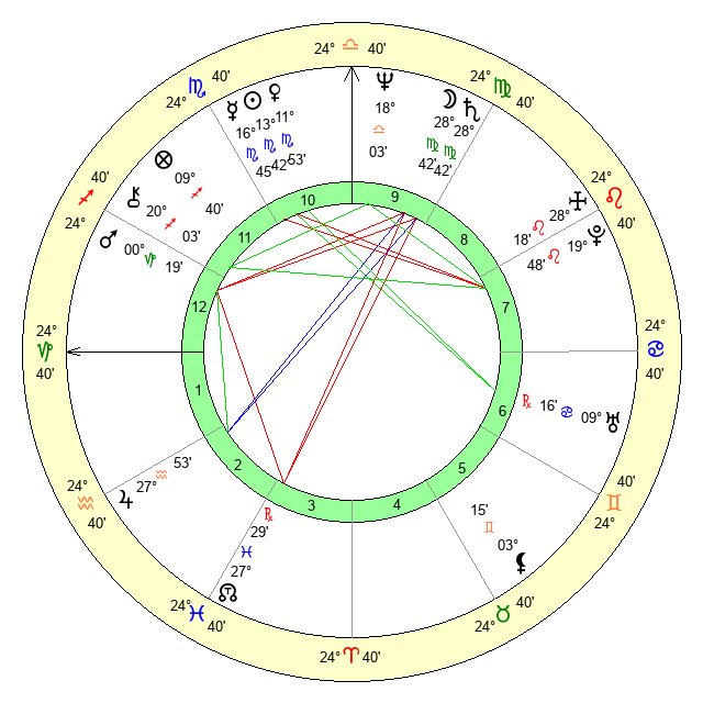 | Moon | 28 Virgo 45 | 0 Gemini 53 | 1 Cancer 56 |