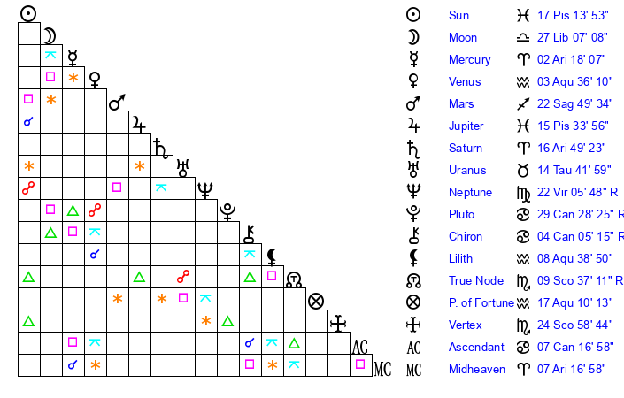 | Sun | 17 Pisces 14 | 18 Pisces 22 | 11 Gemini 15 |