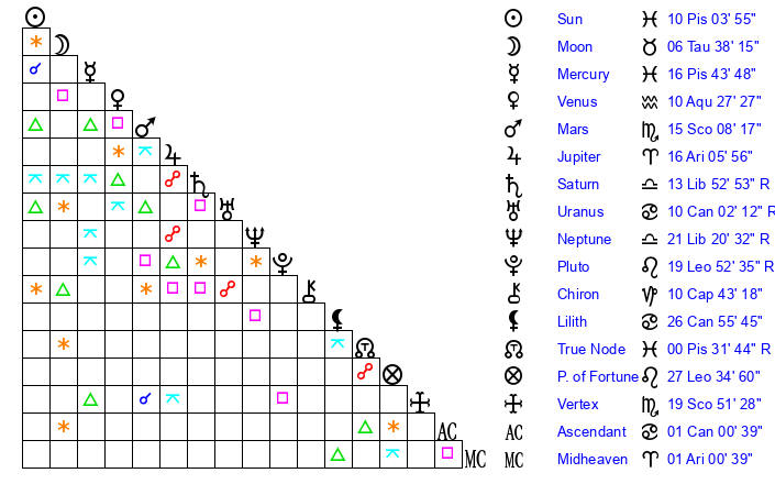 | Sun | 10 Pisces 4 | 11 Pisces 22 | 21 Taurus 53 |