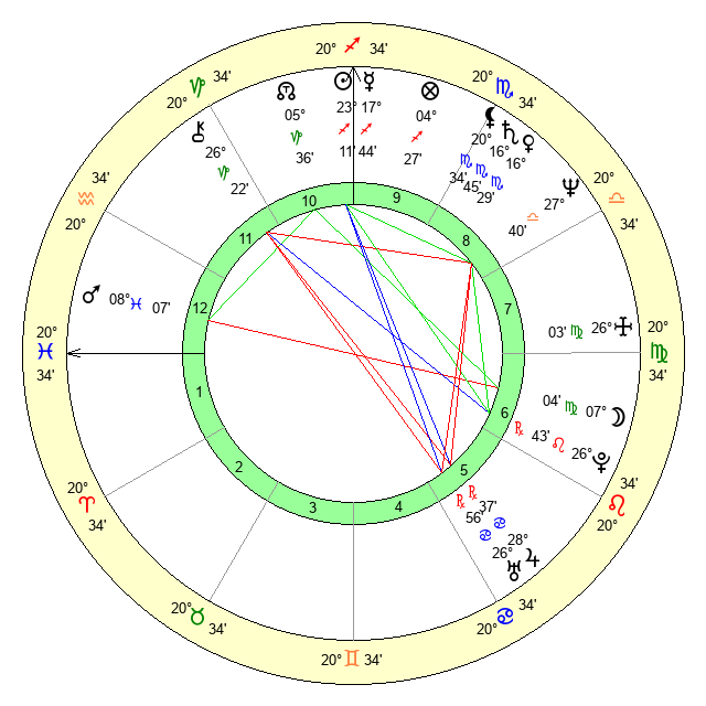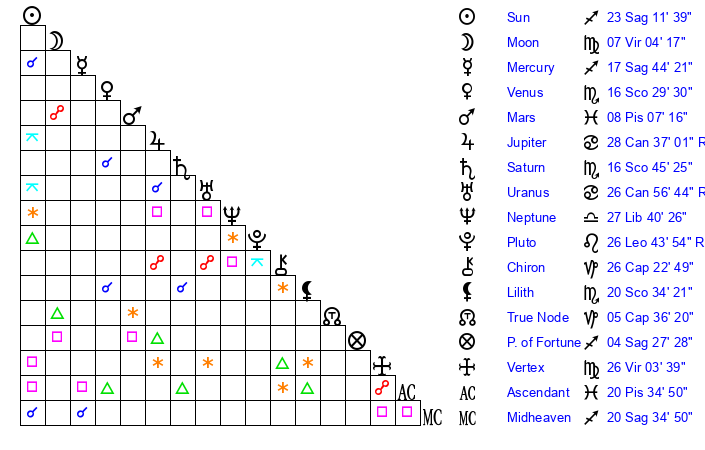 | Saturn | 17 Scorpio 12 | 25 Pisces 20 | 21 Scorpio 38 |