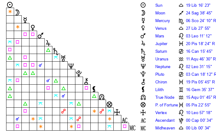 | Sun | 19 Libra 16 | 20 Libra 36 | 10 Aquarius 30 |
