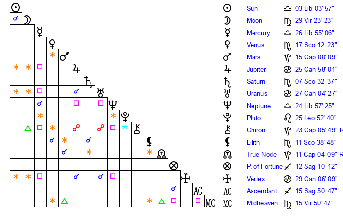 | Mercury | 26 Libra 55 | 14 Libra 14 | 3 Sagittarius 44 |
