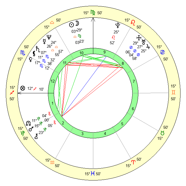 | Venus | 17 Scorpio 12 | 8 Virgo 47 | 14 Scorpio 40 |