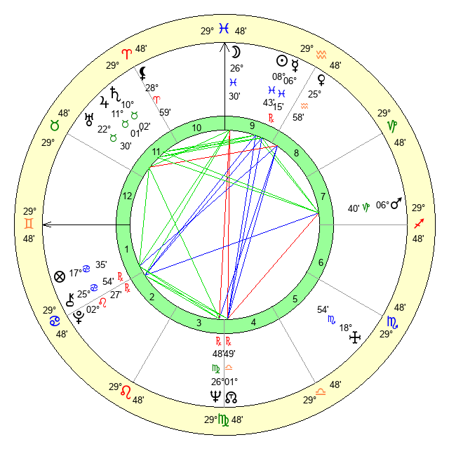| Sun | 8 Pisces 43 | 9 Pisces 21 | 1 Gemini 11 |