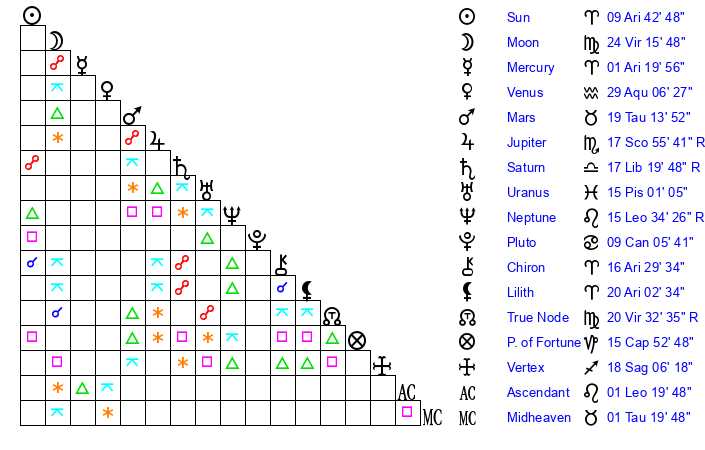 | Moon | 24 Virgo 22 | 9 Taurus 14 | 17 Gemini 36 |