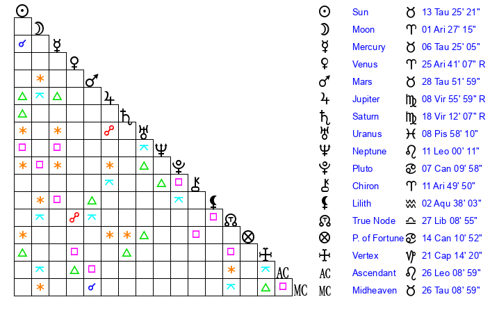 | Neptune | 10 Leo 59 | 1 Aries 12 | 13 Leo 51 |