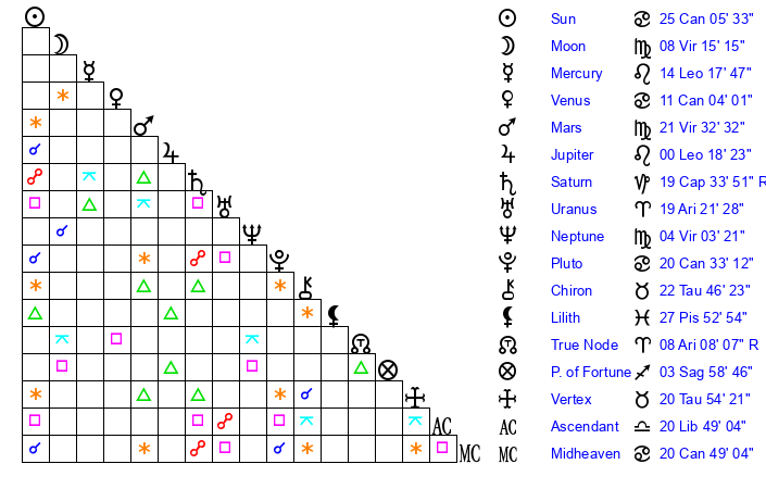 | Sun | 25 Cancer 5 | 26 Cancer 19 | 26 Libra 20 |