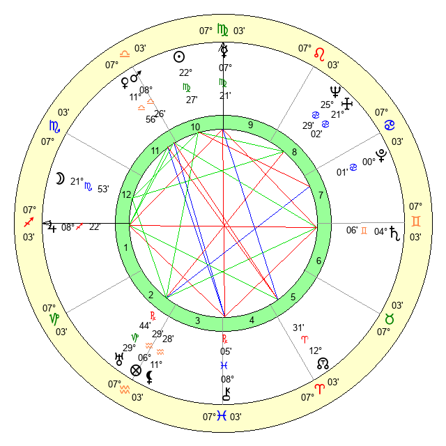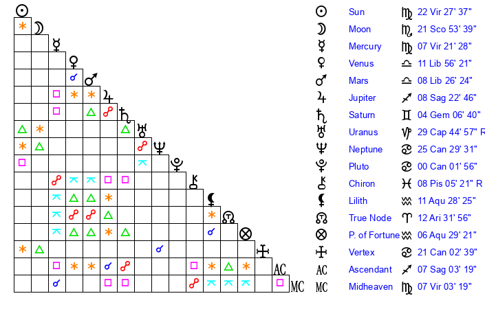 | Moon | 22 Scorpio 1 | 9 Cancer 23 | 7 Capricorn 32 |