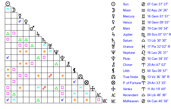 | Pluto | 10 Cancer 38 | 3 Aquarius 8 | 12 Cancer 22 |