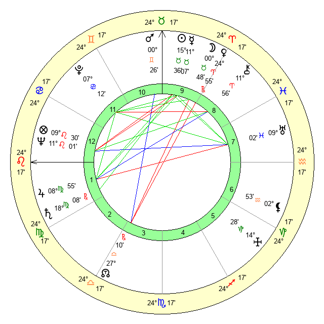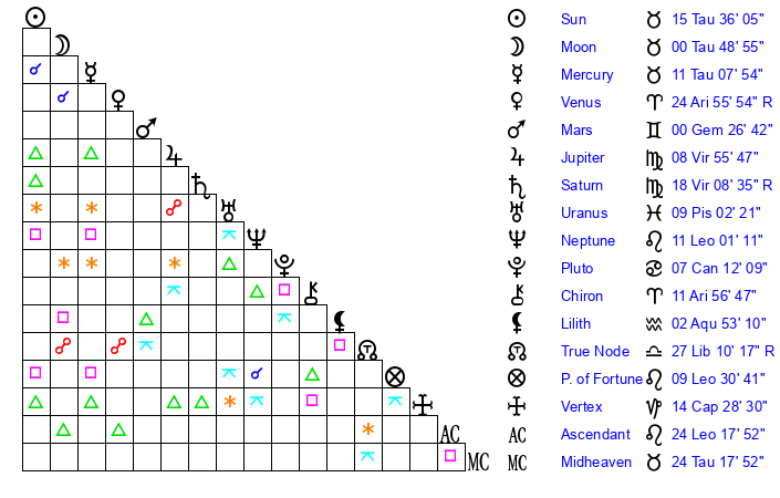 | Moon | 0 Taurus 51 | 10 Virgo 57 | 25 Aquarius 55 |