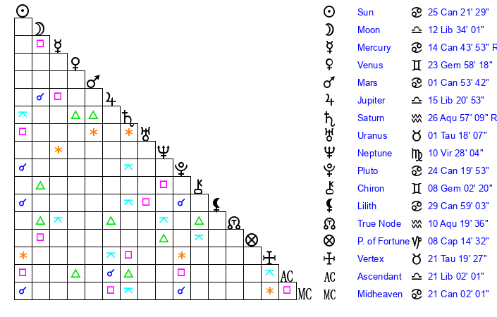 | Sun | 25 Cancer 21 | 26 Cancer 19 | 23 Libra 38 |