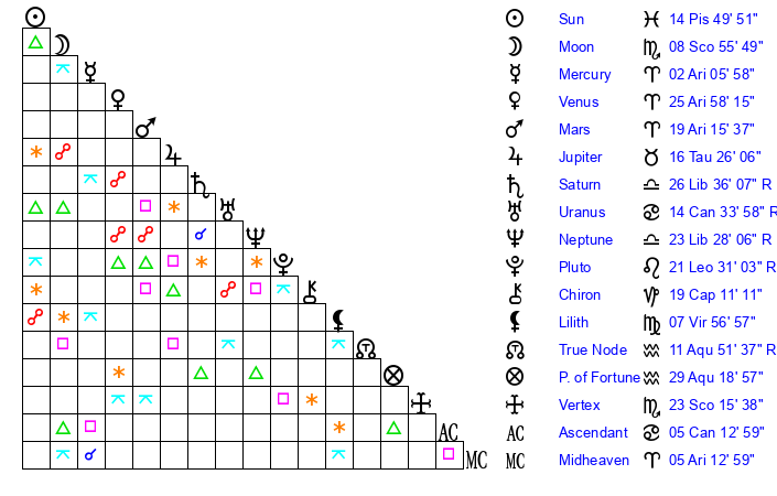 | Neptune | 23 Libra 28 | 29 Pisces 4 | 21 Libra 39 |
