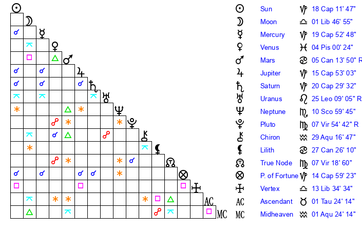 | Neptune | 10 Scorpio 59 | 27 Pisces 25 | 11 Scorpio 3 |