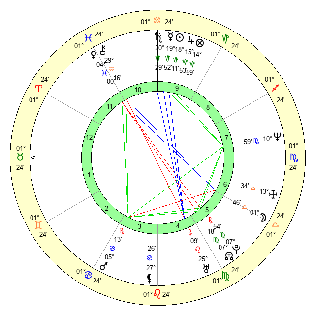 | Moon | 1 Libra 42 | 11 Taurus 11 | 10 Aquarius 51 |