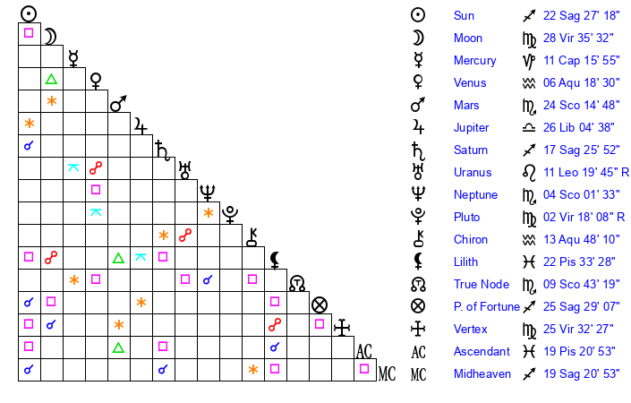 | Saturn | 17 Sagittarius 48 | 25 Pisces 18 | 24 Sagittarius 35 |