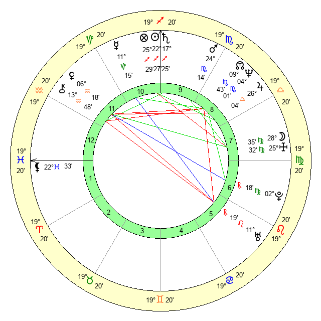 | Moon | 28 Virgo 31 | 24 Libra 34 | 24 Pisces 1 |