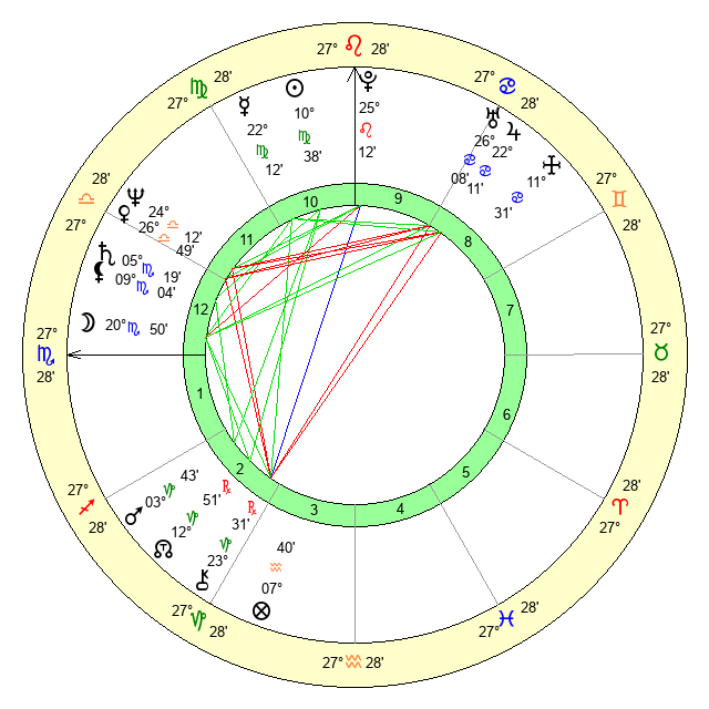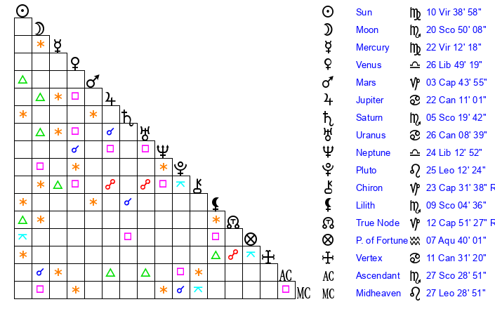 | Mercury | 22 Virgo 12 | 2 Virgo 12 | 1 Scorpio 41 |