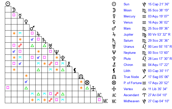 | Saturn | 29 Scorpio 52 | 26 Pisces 26 | 3 Sagittarius 15 |