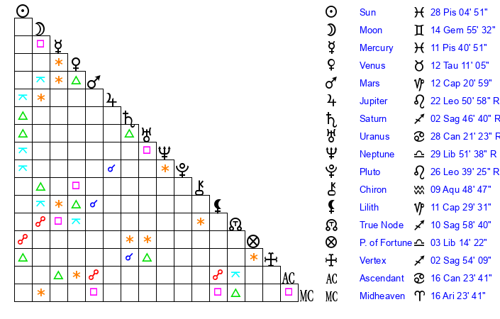| Sun | 28 Pisces 4 | 28 Pisces 21 | 5 Gemini 23 |