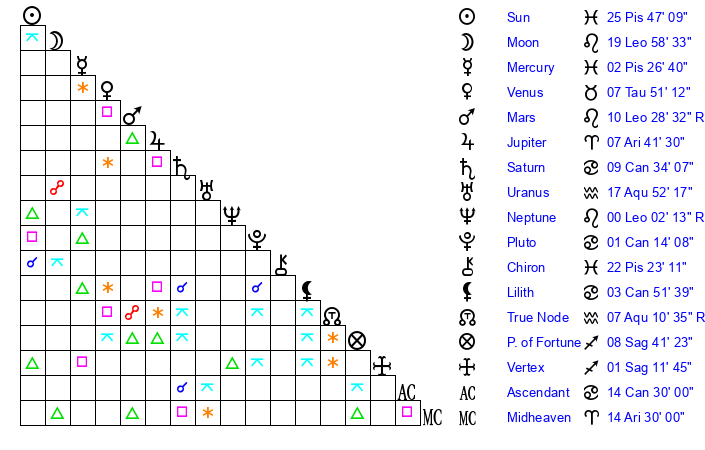 | Sun | 25 Pisces 47 | 26 Pisces 21 | 11 Cancer 23 |