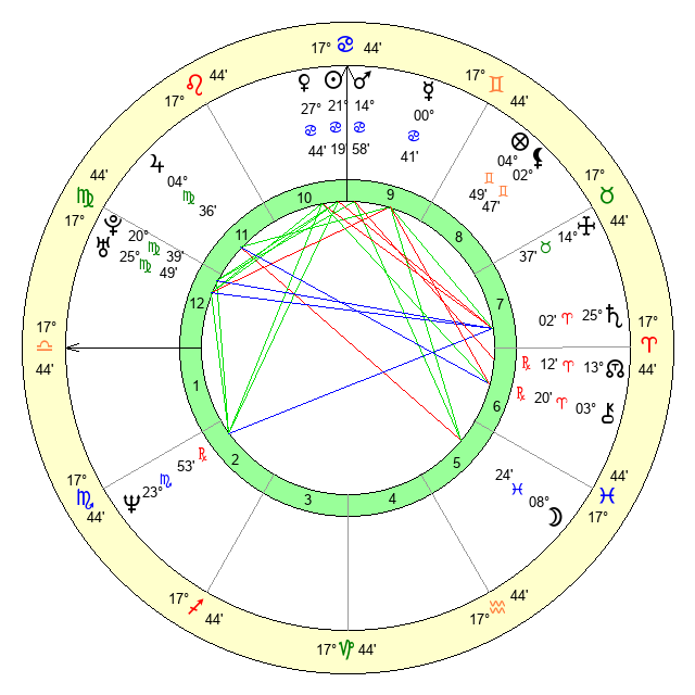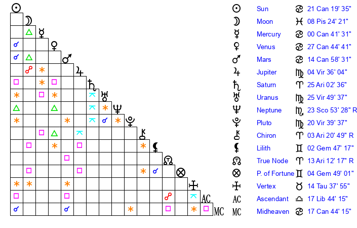 Venus | 27 Cancer 45 | 10 Gemini 5 | 7 Libra 55 |