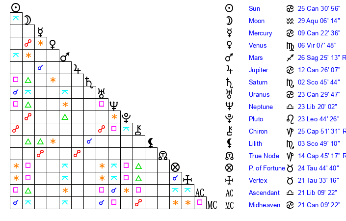 | Sun | 25 Cancer 31 | 26 Cancer 19 | 4 Libra 2 |