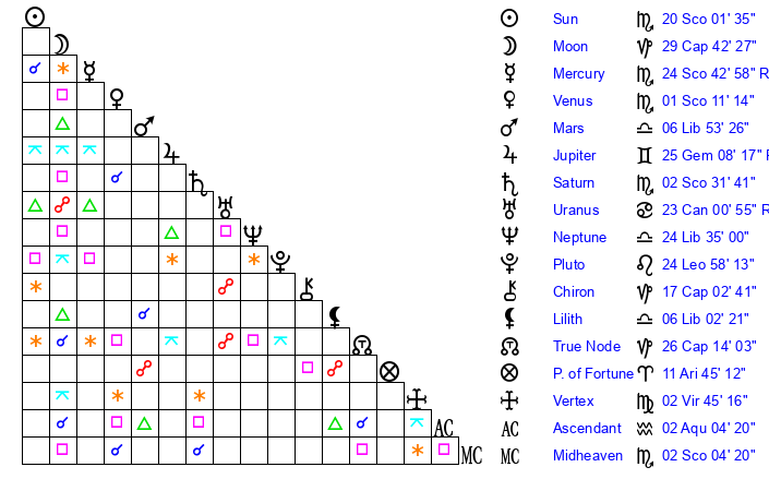 | Sun | 20 Scorpio 1 | 20 Scorpio 34 | 3 Aquarius 10 |