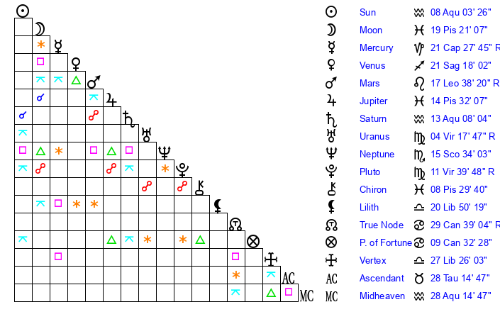 | Saturn | 13 Aquarius 22 | 17 Pisces 0 | 20 Aquarius 14 |