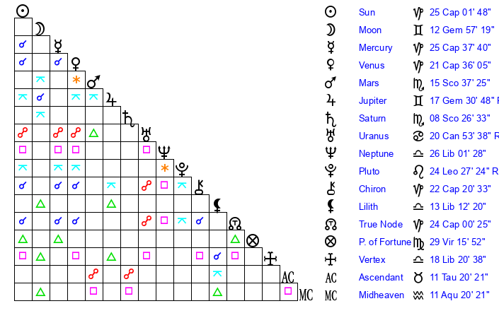 | Neptune | 26 Libra 1 | 27 Pisces 33 | 25 Libra 11 |