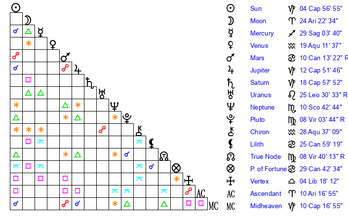 | Saturn | 19 Capricorn 15 | 14 Pisces 5 | 26 Capricorn 27 |