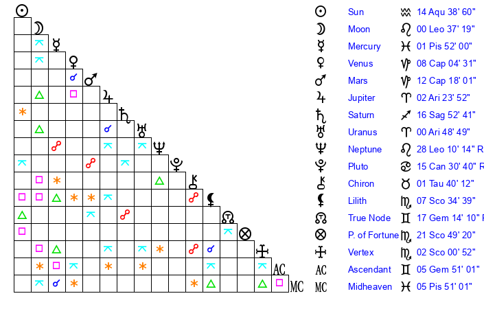 | Sun | 14 Aquarius 39 | 16 Aquarius 8 | 20 Taurus 44 |