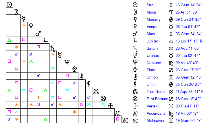 | Sun | 16 Gemini 14 | 17 Gemini 12 | 13 Virgo 23 |
