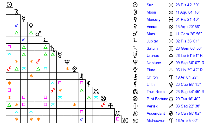 | Sun | 28 Pisces 42 | 29 Pisces 20 | 18 Taurus 41 |