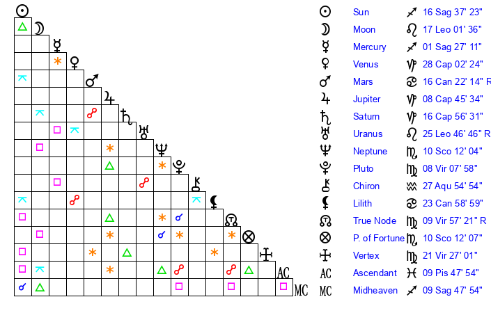 | Sun | 16 Sagittarius 38 | 16 Sagittarius 51 | 22 Aquarius 45 |