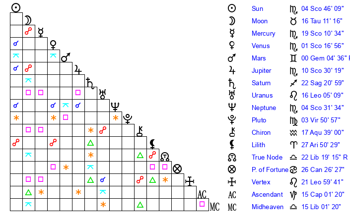 | Moon | 16 Taurus 14 | 24 Capricorn 21 | 29 Libra 3 |