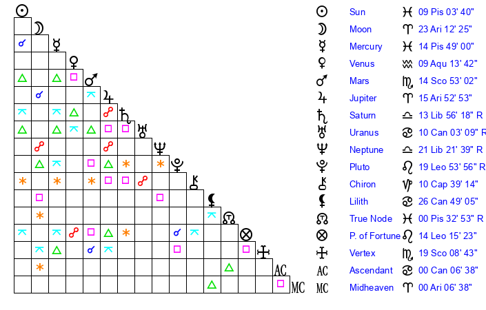 | Moon | 23 Aries 13 | 19 Pisces 32 | 15 Sagittarius 31 |