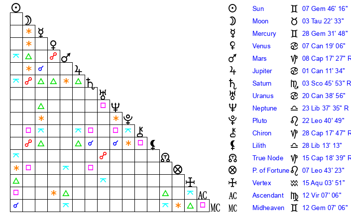 | Moon | 3 Taurus 24 | 14 Cancer 10 | 6 Sagittarius 46 |