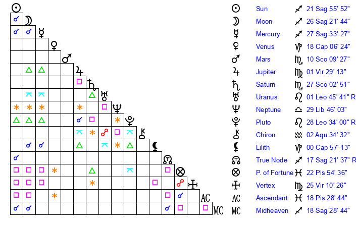 | Mars | 10 Scorpio 10 | 29 Sagittarius 33 | 25 Sagittarius 59 |