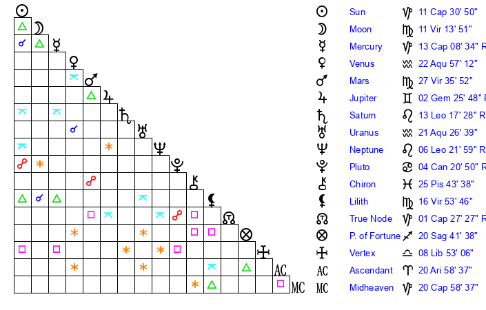 | Mars | 27 Virgo 36 | 14 Capricorn 0 | 14 Virgo 0 |