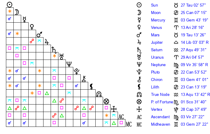 | Sun | 27 Taurus 3 | 28 Taurus 0 | 24 Leo 4 |