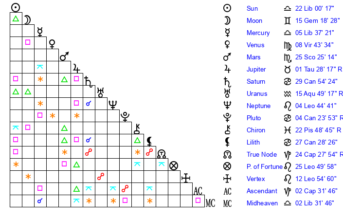 | Sun | 22 Libra 0 | 22 Libra 35 | 12 Aquarius 17 |