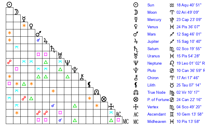 | Pluto | 10 Cancer 36 | 2 Aquarius 17 | 10 Cancer 50 |