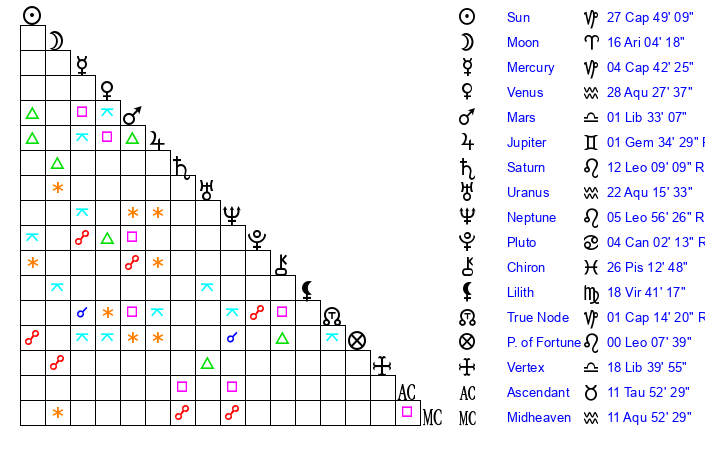 Moon | 16 Aries 1 | 24 Virgo 40 | 7 Pisces 42 |